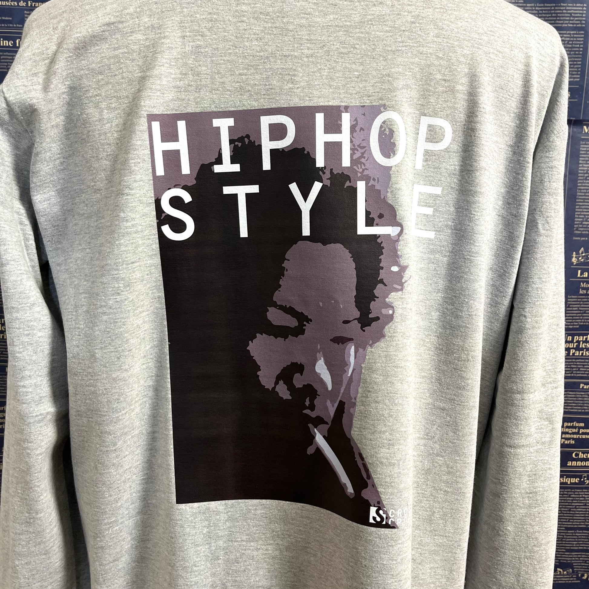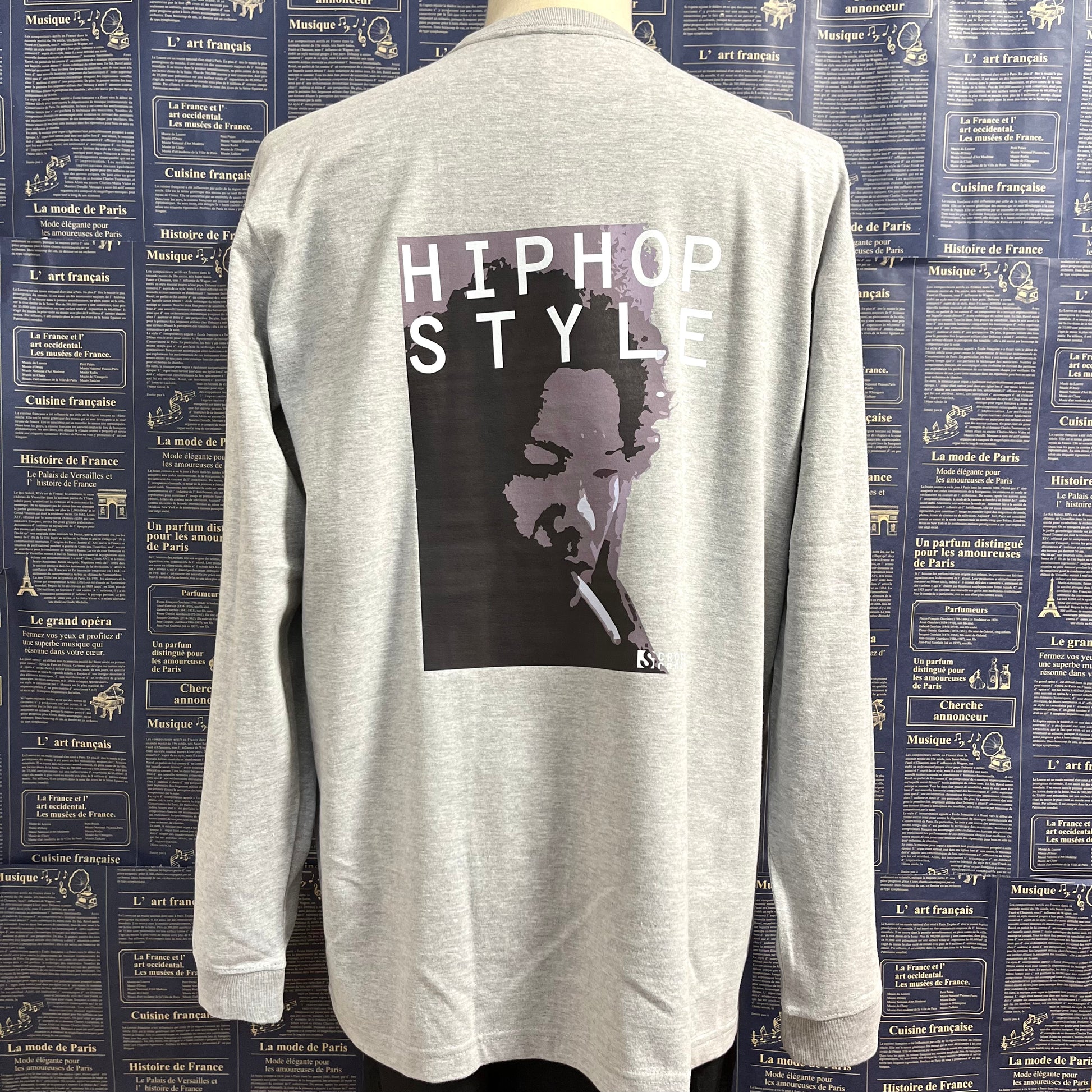 背中にフォトデザイン、胸元にボックスロゴのワンポイントが施されたプリントロンT。
